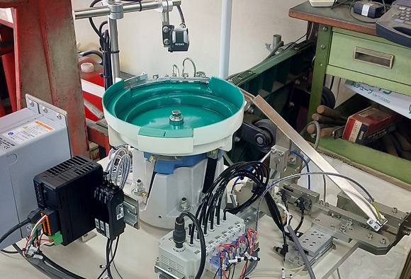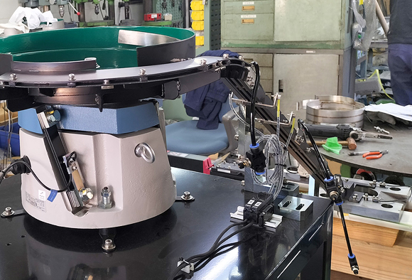 整列した金属部品を外観検査で不良品チェックしてから排出・供給する多品種兼用型パーツフィーダーです。