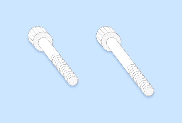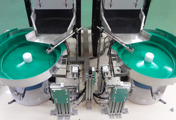 長さの異なる二種類のボルトを誤混入防止の為二台のパーツフィーダーに分配して同時進行で整列します。