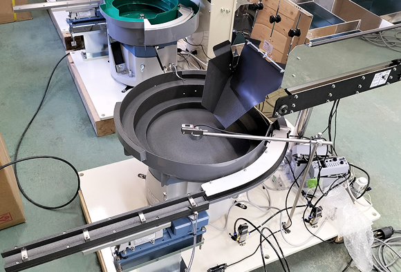プラスチック製絶縁キャップを整列・排出する為の省スペースで静音性の高いリターンフィーダーです