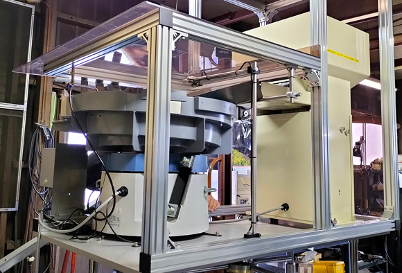 供給能力向上の為合計4列の多列排出を行う防音・防塵カバーに全体を覆われたパーツフィーダーです。