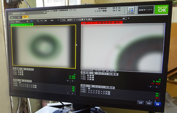 2種類のゴムワッシャー用多品種兼用型(調整式)パーツフィーダーです。整列したワークはベルトコンベアでカメラの下を通り外観検査で良品と不良品を判定、それぞれ別の排出口に分別します。ユニットの操作・設定・制御や検査の設定等はタッチパネルで行い検査状況は PCモニターでリアルタイムに確認出来ます。