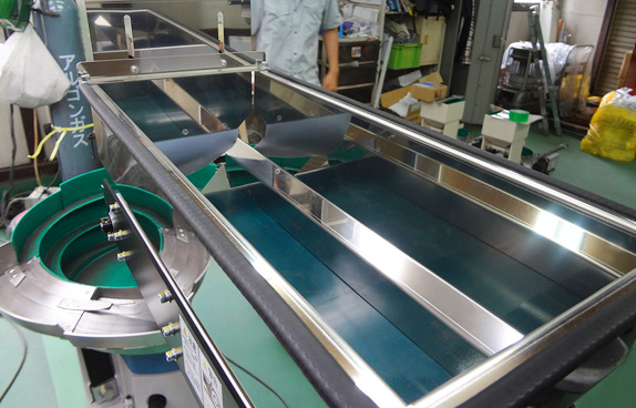 製品実績 「セラミックスパーツ整列機」 会社案内 パーツフィーダーとは 製品実績 納品までの流れ よくあるご質問 お問合せ MENU ホーム 製品実績 セラミックスパーツ整列機 金属部品 セラミックスパーツ整列機 電子部品に使われるセラミック部品用パーツフィーダーで高い供給能力を実現する反面、ワークが整列・搬送時に欠けたり破損しないよう各所に気を配り設計・製造いたしました。 セラミックスパーツ 天部分が緩やかに凹んでいるのが方向選別の助けになるので整列・排出しやすいワークになります。 アタッチメント 重量のあるワークの供給能力(タクト)を上げる為にアタッチメント部分を二列にして対応しました。 ベルトコンベア式ホッパー セラミック製のワークの欠けや破損を防ぐ為にホッパーはベルトコンベア式を採用いたしました。 ワーク セラミックスパーツ 供給能力 60個 / 分 (一列あたり) ホッパー ベルトコンベア式 ボウル表面処理 ウレタンコーティング 電源 単相 AC200V 50Hz / 60Hz兼用 製品の種類 金属部品 製造日 2018年06月27日 金属部品 セラミックスパーツ整列機