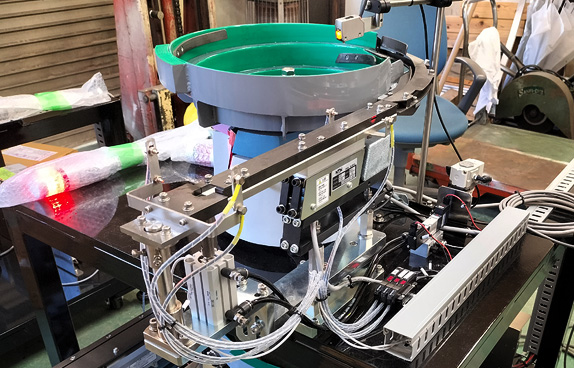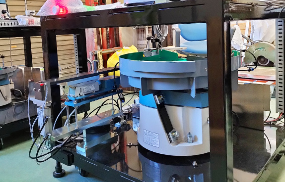 工場での設置場所節約の為架台の上段(ナット用)と下段(六角ボルト用)に異なるワーク用の整列機を載せて省スペース化を図ったパーツフィーダーを合計4セット製作いたしました。