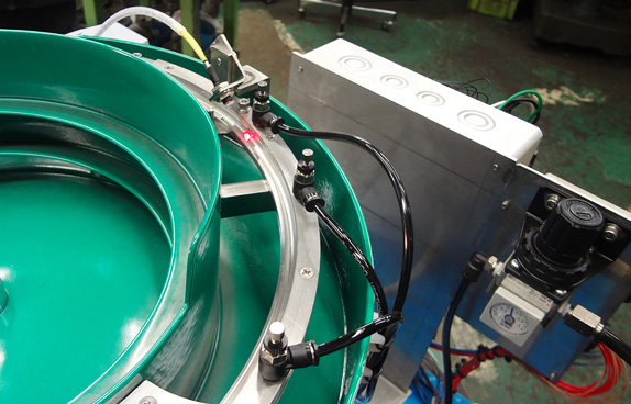 製品実績 「抵抗器整列・計数機」 会社案内 パーツフィーダーとは 製品実績 納品までの流れ よくあるご質問 お問合せ MENU ホーム 製品実績 抵抗器整列・計数機 [検査機] 金属部品 抵抗器整列・計数機 抵抗器は前後選別の難易度が高いワークなのでセンサーやエアー、アタッチメントを使い表裏を判定します。また、形状的に振動ではシュートに詰まりやすい為傾斜型を採用、排出する際にはセンサーで計数後次工程の機械が受け取りやすいように切り出します。 抵抗器 形状的に前後選別が難しく端子の足がシュートで詰まってしまう場合があるので対策が必要です。 エアー ワークの表裏選別を行うアタッチメントの一部として使用しますがシリンダーの駆動動力にもなります。 計数センサー ワークの排出数を正確に計測する為に離れた場所からでも検出可能なレーザーセンサーを使用します。 ワーク 抵抗器 供給能力 10個 / 分 (一列あたり) 検査内容 センサーによる排出量計測(カウンター) ボウル表面処理 ウレタンコーティング 切り出し部 ストッパー式 外形寸法 500mm × 600mm × 350mm 電源 単相 AC220V 50Hz / 60Hz兼用 製品の種類 [検査機] / 金属部品 製造日 2014年11月12日 [検査機] 金属部品 抵抗器整列・計数機