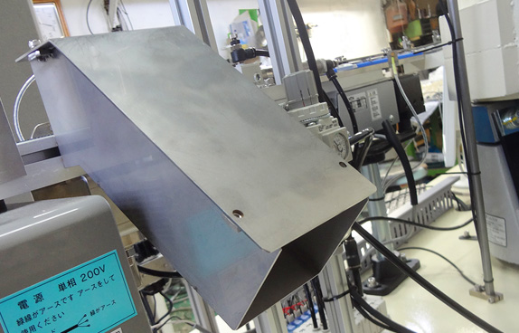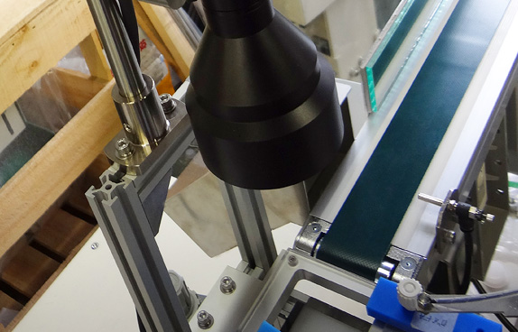 整列後外観検査で不良品を弾き良品のみをベルトコンベアで搬送いたします。ワークに影が出て検査精度が下がらないよう外観検査エリアの下地はクリア板を使用して照明が均一に当たる構造です。また、ワークは3種類ありますが形状やサイズの差異が許容範囲内でしたので多品種兼用型として製作しました。(ワーク形状やサイズが大きく異なる場合兼用対応が困難になりますのでパーツフィーダーの部品を一部交換、もしくは調整での兼用をご提案させていただきます)