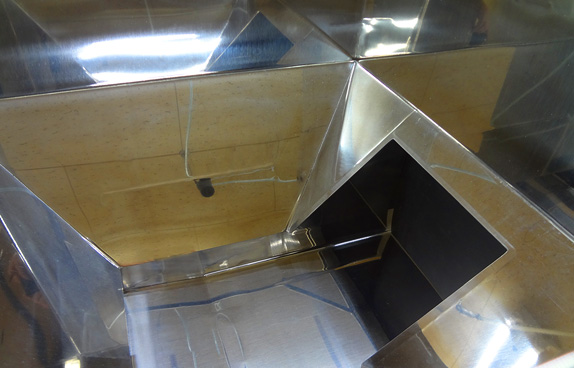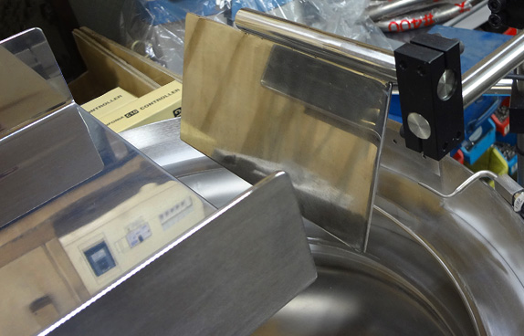 食品関係用プラスチック製透明容器を整列・排出させるパーツフィーダーです。透明容器は比較的大きいサイズで1分間に80個という高タクトが必要になり約5000個をストックする大型ホッパーや渋滞防止に長めのシュートを装着の上エアーや各種アタッチメントを駆使して対応いたします。