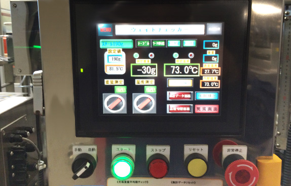 ペットボトルやスチール缶に飲料を充填後、重量の誤差判定(ボトルウェイトチェッカー)と温度の自動測定(温度測定機構)をワンストップで行う多品種兼用型自動機です。検査で収集したチェックデータ(処理数・重量・温度・不良率等)の管理はコントロールパネルで簡単に行え約一ヶ月分のデータを保持、PCや記録メディアへの保存も可能です。