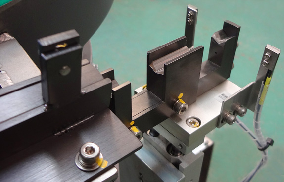 シュートの先端に振動しない箇所を作りここにワークを切り出して待機させピックアップを待ちます。