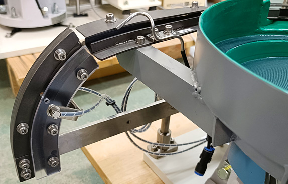 製品実績 「巻きブッシュ整列機」 会社案内 パーツフィーダーとは 製品実績 納品までの流れ よくあるご質問 お問合せ MENU ホーム 製品実績 巻きブッシュ整列機 金属部品 巻きブッシュ整列機 巻きブッシュと言われるスリットが入った金属パイプを整列・供給するパーツフィーダーを二台製作いたしました。シュート部分をタフトライド加工(窒化処理)して金属製ワークの搬送による摩耗から守ります。 巻きブッシュ スリットが入っていますが通常の金属管と変わらず整列しやすいワークになります。 満杯センサー(非接触型) ボウル内のワーク量をセンサーで監視して残量が少なくなるとホッパーから補充し部品切れを防ぎます。 シュート先端 ワークをエアーで射出して次工程の機械に供給する為シュート先端部が下向きになっています。 ワーク 巻きブッシュ 供給能力 30個 / 分 (一列あたり) ホッパー 振動式 ボウル表面処理 ウレタンコーティング + シート貼り 電源 単相 AC200V 50Hz / 60Hz兼用 製品の種類 金属部品 製造日 2025年06月17日 金属部品 巻きブッシュ整列機